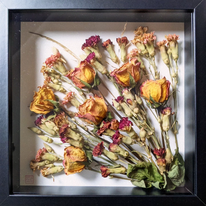 Dried roses are arranged with the image of a rose garden filled with butterflies in mind.
